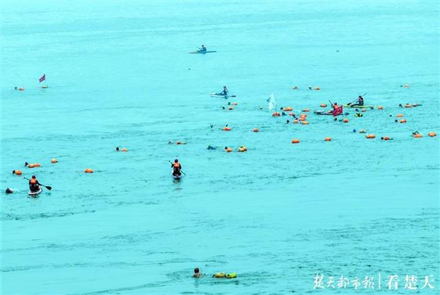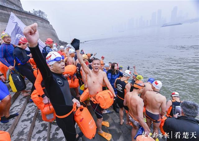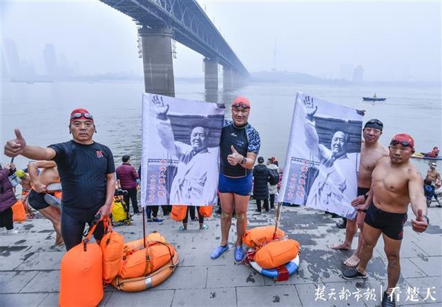 在现场,队员出发前,现场观众、队员高亢的口号呐喊:武汉雄起!现场人群热情高涨,扬起毛泽东同志当年渡江的影像旗帜,表达人们的缅怀之情。