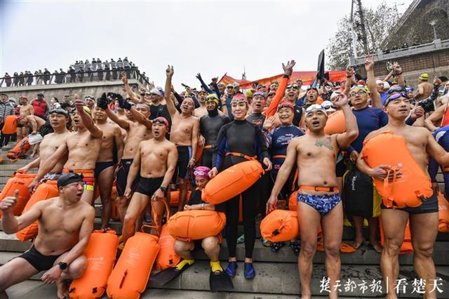 冬泳爱好者从武昌汉阳门长江边下水