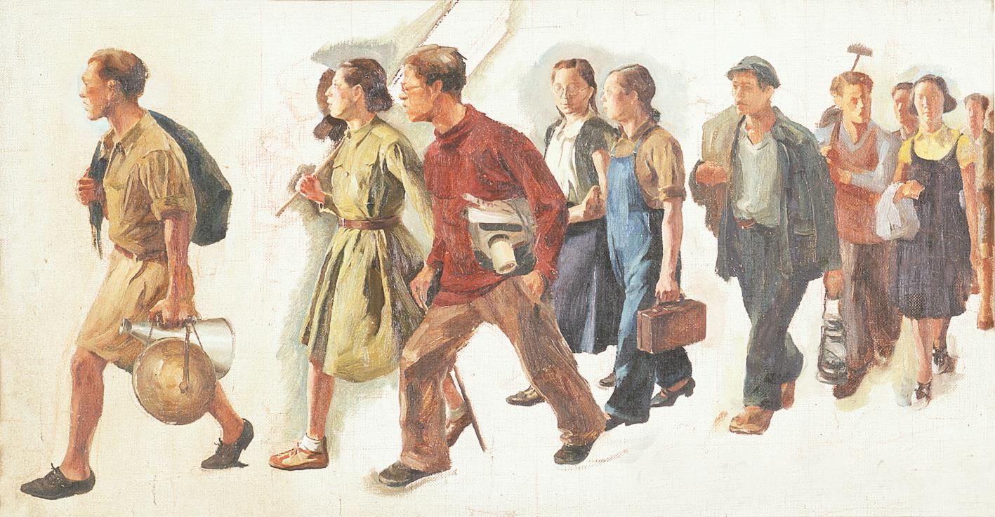 唐一禾作品《七七的号角》(画稿)是1940年为创作巨幅油画而制成的草图,表现一支由青年学生组织的宣传队奔赴城乡进行抗日宣传的情景。尽管因教学的繁重和生活的不安稳,此画没有最终完成,但就遗存的草图来看,画中人物既有个性特征,又揭示出那个时代热血青年的共同气质,队列的行进感和朴实无华的暖色调很好地表现了这一主题,极有号召力。