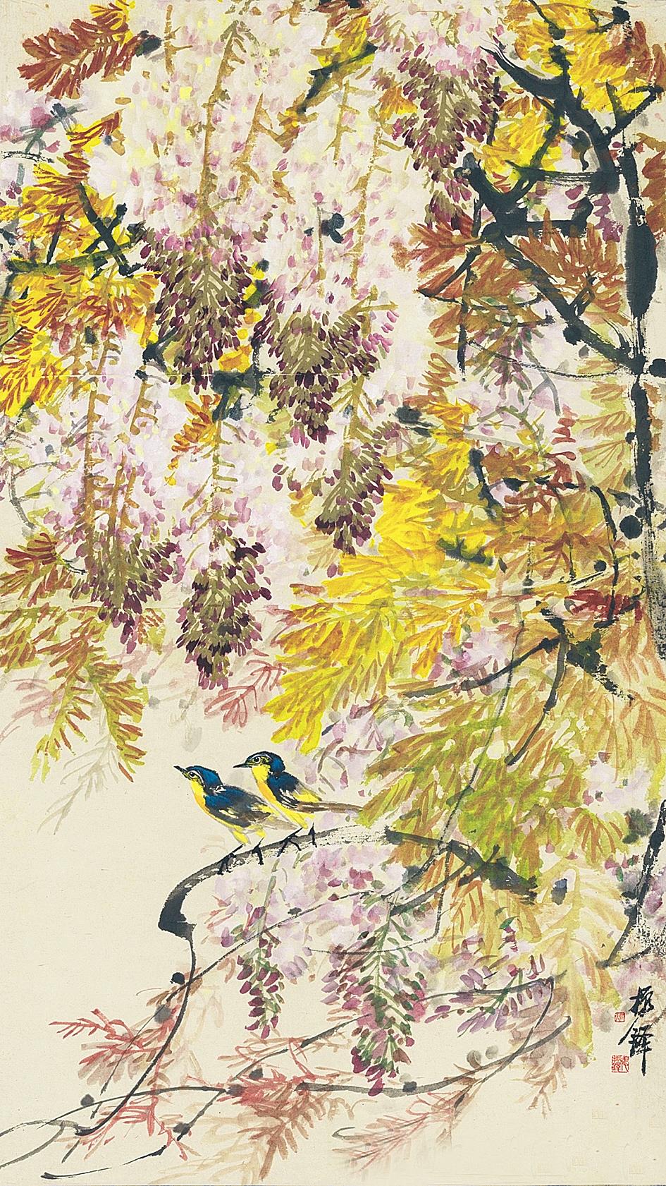 张振铎 紫藤双雀 1975年 中国画 105×59.5cm