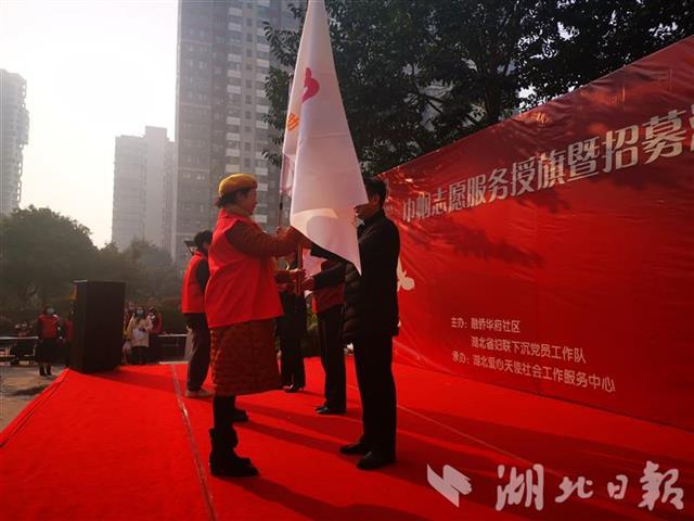 在招募活动中,湖北省妇联相关负责人为三支巾帼志愿服务队授旗,向社区捐赠200份总价值10万元的爱心大礼包。