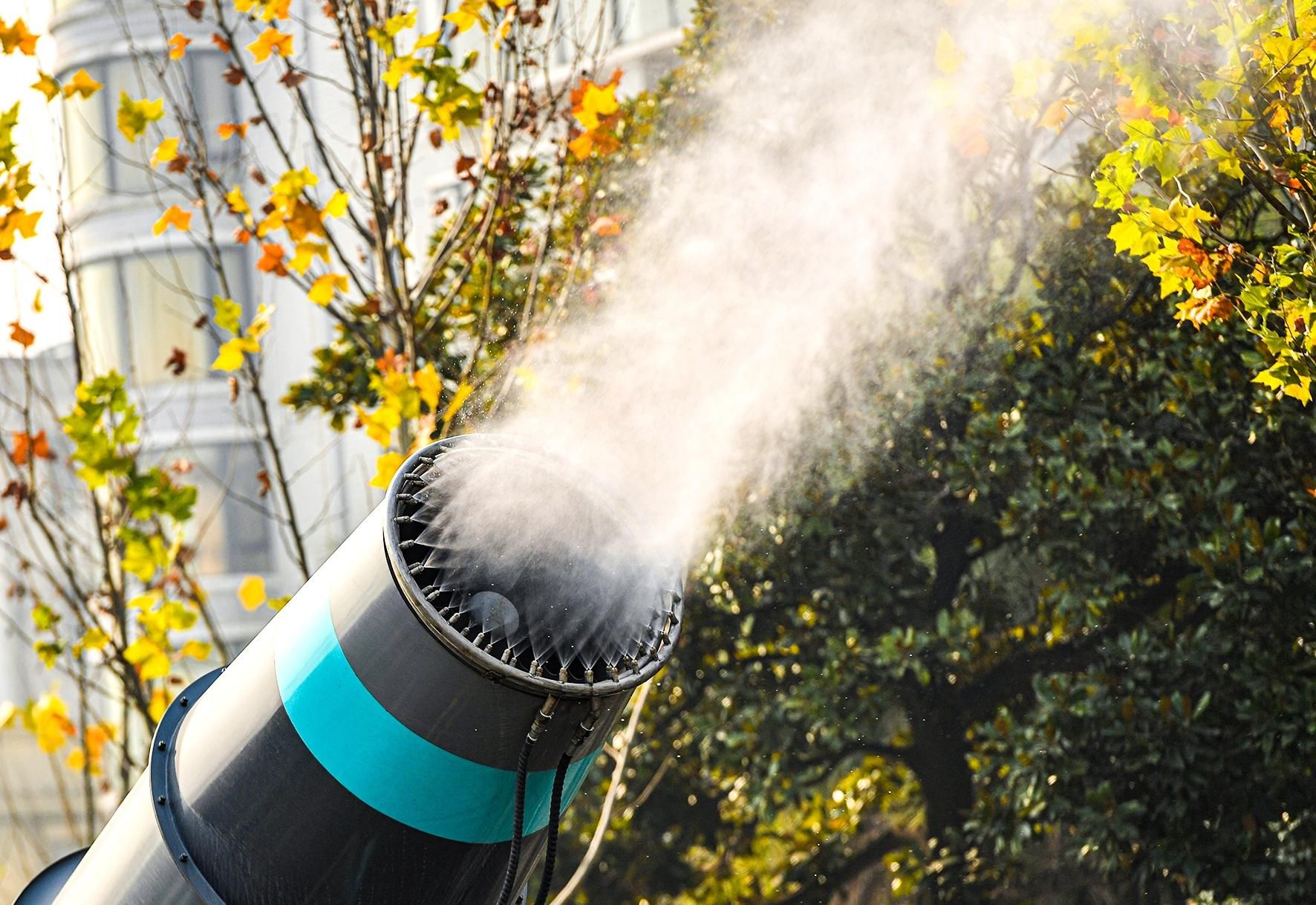 下午1时许,江岸区沿江大道上,一辆喷雾洒水车底部的喷头正喷洒水雾,对路面进行除尘处理。后方不远处,一辆雾炮车缓缓驶来,车尾的喷雾装置通过高压将水雾化成微米级的水雾颗粒,与空气中的雾霾碰撞、吸附凝结成粉尘团,减少空气中的尘埃,净化空气。