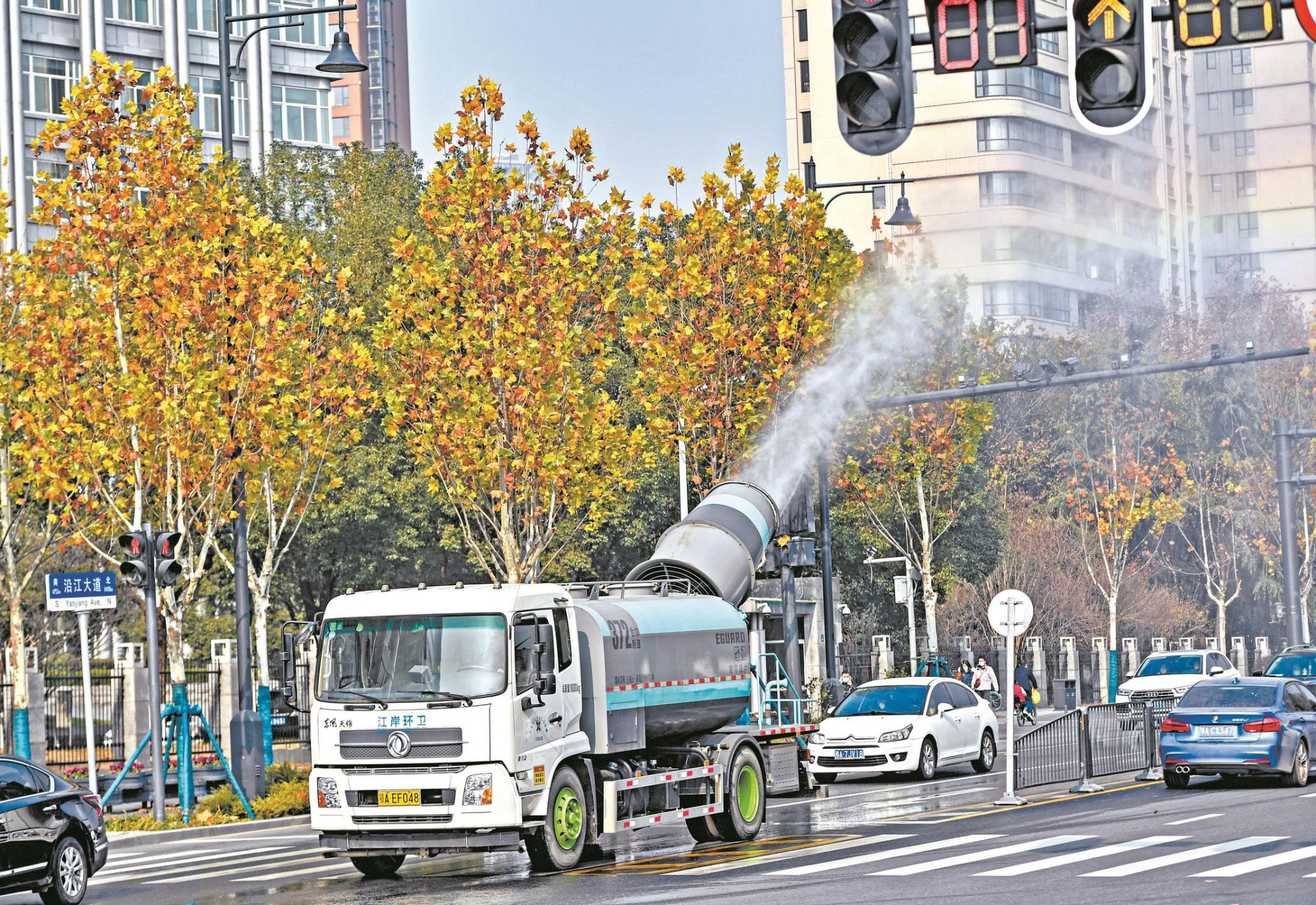 江岸环卫集团业务部主任黄鹏介绍,全市启动重污染天气Ⅲ级预警响应后,江岸区环卫部门严格按照市、区部署要求,增加压尘作业频率,白天出动60余台各类水洗设备,对全区23条辖区主干道255条背街小巷,以及三环线、二环线等快速路和高架桥,开展不间断洒水压尘,作业频次从原先每天两次增加至现在的五次。同时压尘作业根据规定避开早晚行车高峰时段,并严格执行文明作业规范及低温作业要求。