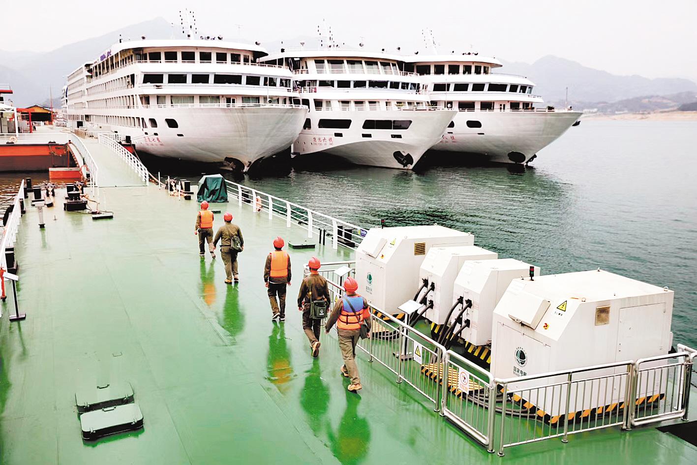 宜昌三峡岸电运营服务公司员工在宜昌秭归港巡视岸电设备。(通讯员 李兴衡 摄)