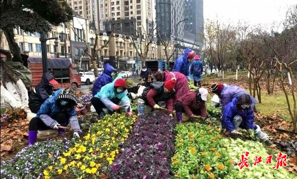 武昌区园林工人冒着雨夹雪,在临江大道游园布置时令花卉。通讯员吴凯 摄