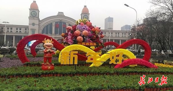 汉口火车站门前的花篮造型,新增了丑牛生肖和红黄飘带,饰以三色堇、金鱼草、石竹等花卉,让人耳目一新。(记者明眺生 通讯员赵旋 夏大会 彭雪琴 刘壮)