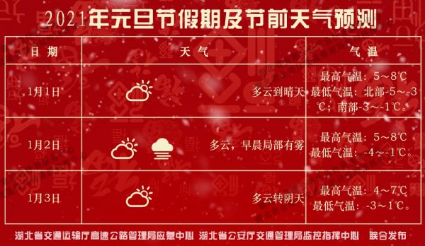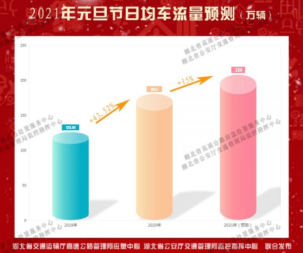 长江网12月29日讯 2021年元旦假期即将来临,放假时间为1月1日至1月3日,共计3天。根据湖北省高速公路管理局对历年来省内高速路网运行动态分析,预计节日期间全省车流量较日常将有较大幅度提升,路网车流主要以短途出行为主,需要注意的是,元旦假期小型客车行驶高速公路是不能享受免费通行政策的。根据省高管局应急中心对往年路网运行数据分析,元旦假期高速路网整体车流量将呈现“前高后低、逐日下降”态势。