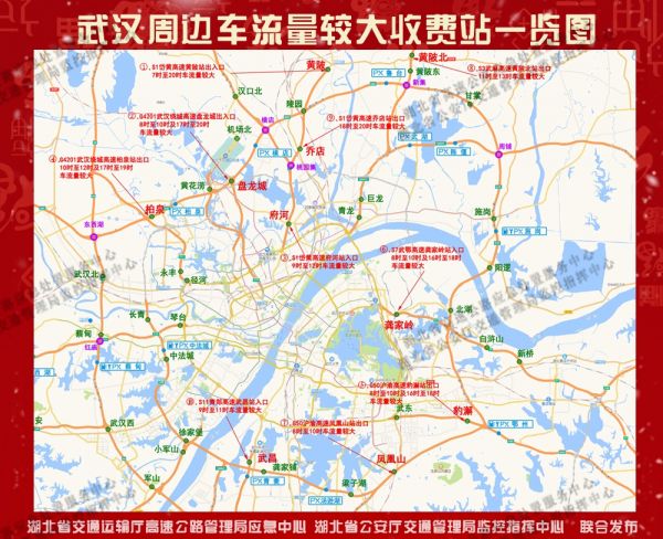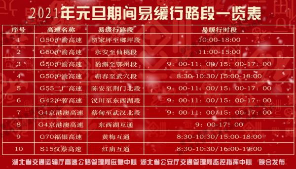 预计元旦期间全省高速公路重点通道的车流量将显著上升,从往年经验看,高速公路车流量较大时,可从就近收费站下高速公路,绕行与之平行的国、省道,会更加快捷;进出武汉市的车辆,由于绕城高速、四环、三环、二环线和出城快速通道是连通的,可以根据实际情况避开易缓行路段灵活绕行。