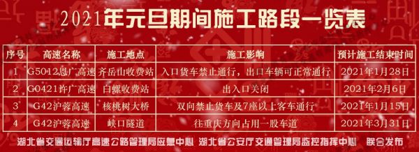 元旦期间全省高速路网共有四处施工点。