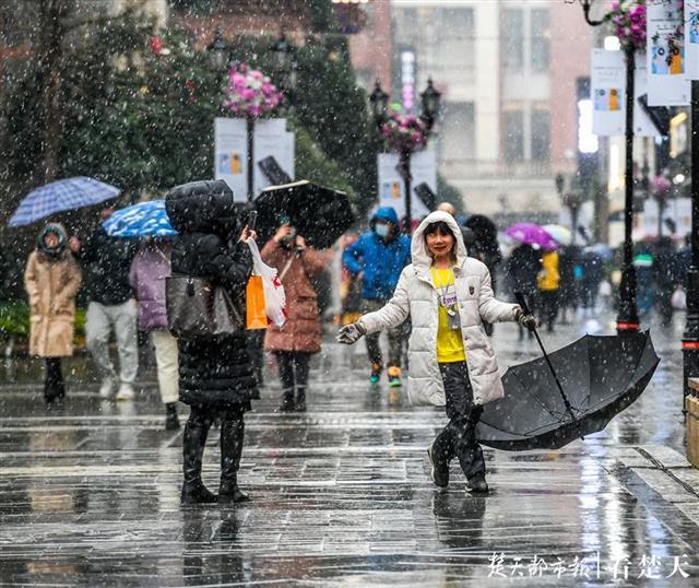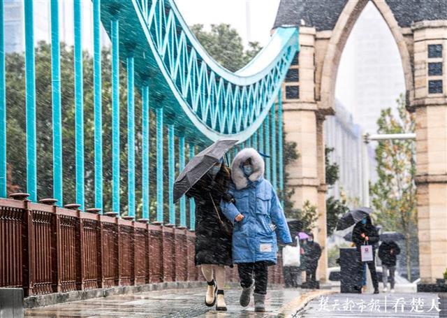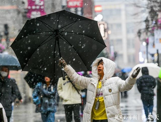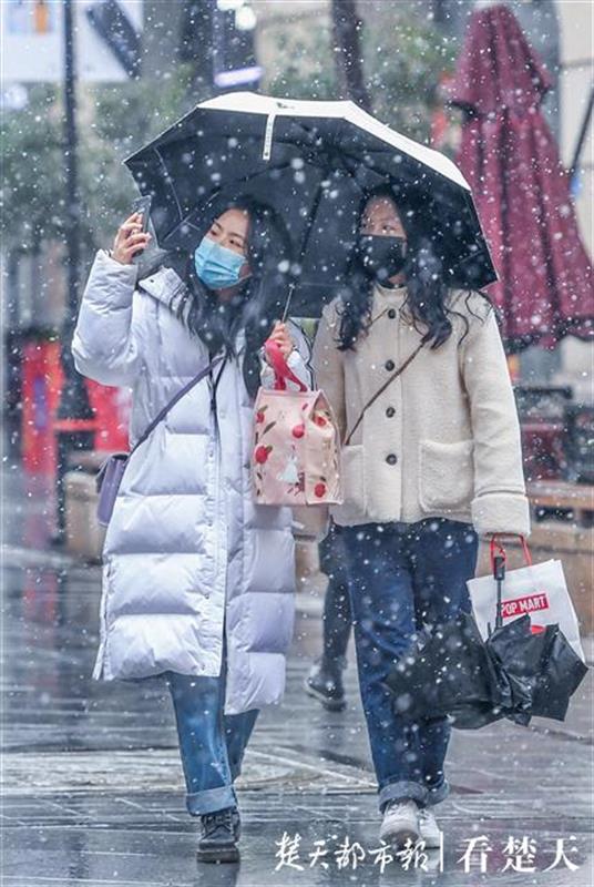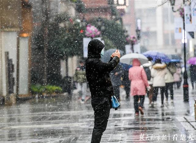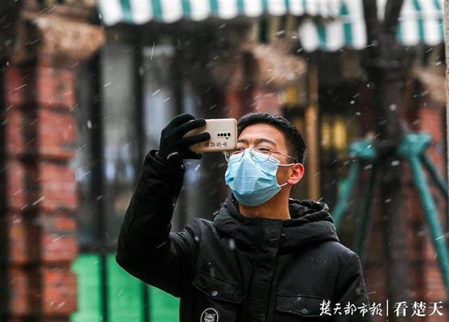 记者在武昌东湖路、楚河汉街等处看到,风雪中的行人神情淡定,不少人颇为欣喜,纷纷拿出手机拍下这难得的雪景分享给亲朋好友。