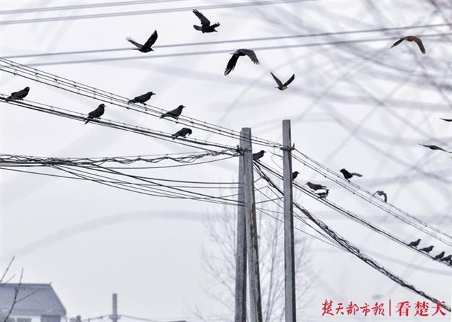 楚天都市报12月29日讯(记者陈希李辉)今日下午3时许,记者从武汉木兰山下来,路过黄陂区黄土公路李家独屋附近看到壮观一幕:数千只乌鸦在稻田里觅食,吃饱了的乌鸦或傲娇地一排排站在电线上,或成群与风雪共舞。