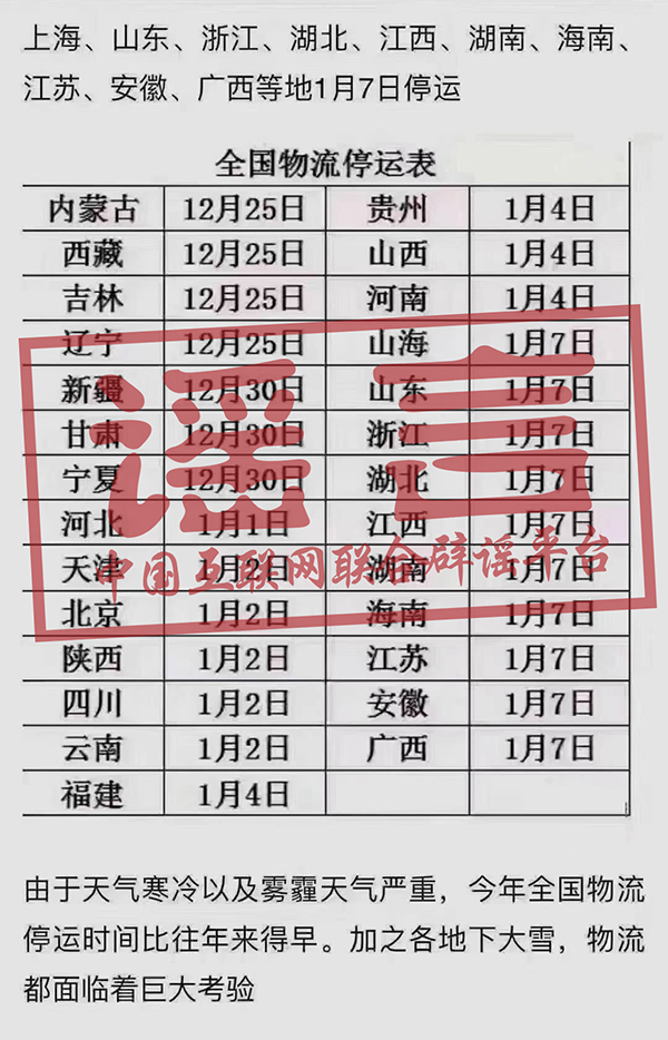 真相:网络热传的所谓“时间表”是根据历年传言拼凑嫁接的,纯属捏造。事实上,快递公司放假或运输线停运是各快递公司根据情况自行决定的,没有全国统一的时间表。