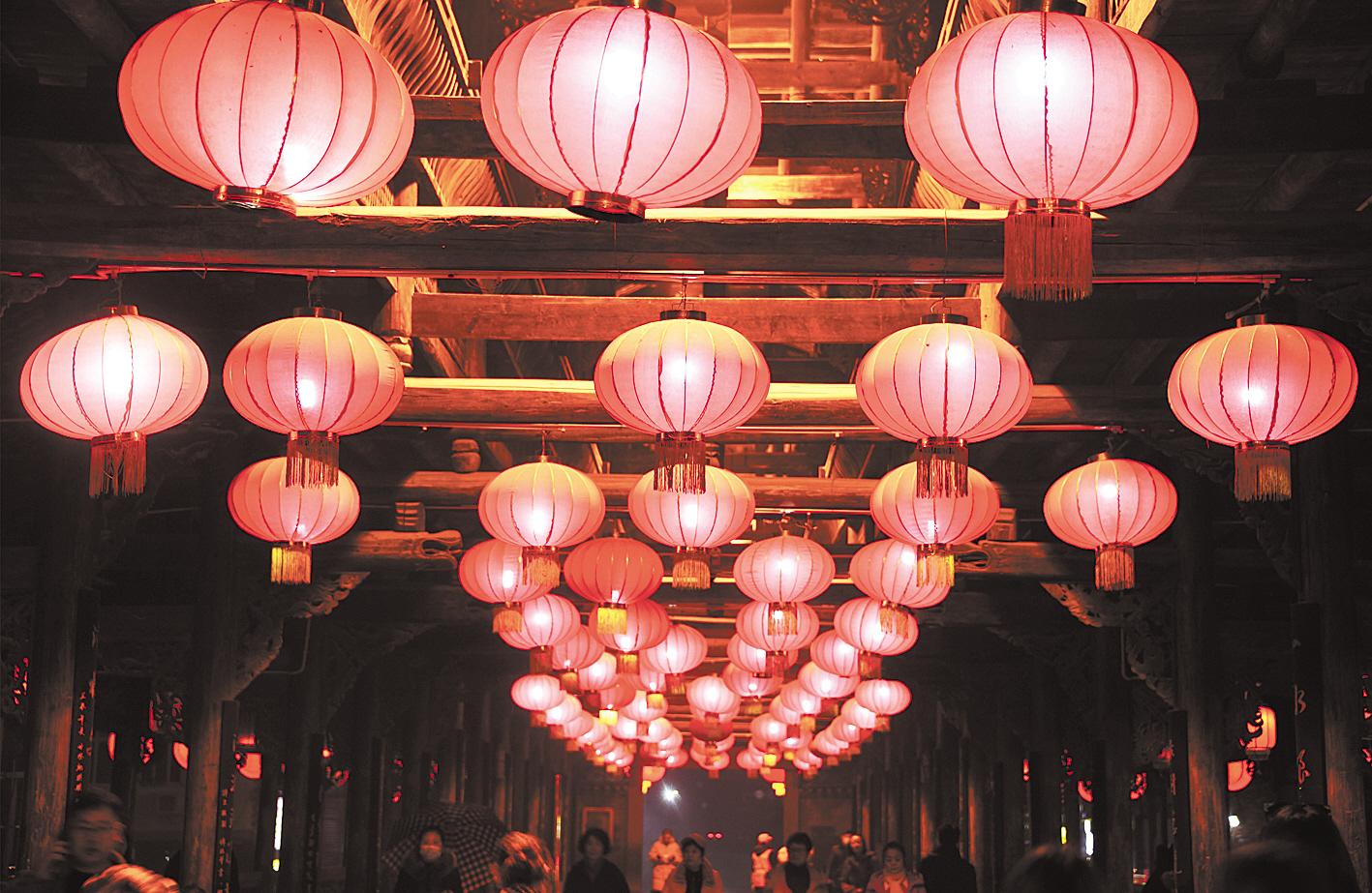 12月28日,宣恩县城贡水河畔,游客走在挂满红灯笼的风雨桥上。元旦前夕,宣恩县城贡水河畔,墨达楼、风雨桥等具有土家族、苗族、侗族特色的民族建筑张灯结彩,喜庆景色吸引众多游客驻足欣赏。 (视界网 王俊 摄)