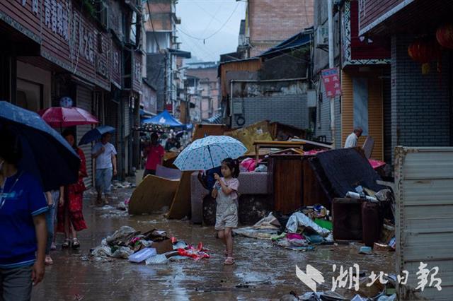 7月18日,山洪过后的恩施市胜利街满目疮痍。7月16日到17日,恩施市普降特大暴雨,导致清江流域河水猛涨,城区部分街道被漫堤河水淹没,多个路段积水严重。7月18日,恩施市城区积水缓慢消退。为尽快恢复城市市容市貌,18日一大早,恩施市各级各部门迅速组织干部职工、环卫工人和维修队伍奔赴各路段,全面展开清淤、保洁和修复等工作。