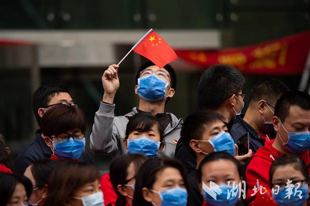3月31日上午,武汉市蔡甸区明德酒店,北京援鄂医护人员在送别仪式上望着手中的红旗。