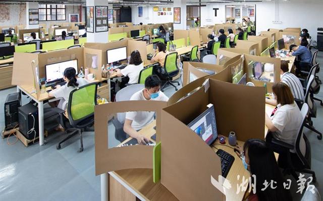 5月19日,武汉市江岸区多牛世界时尚创意产业园,一家企业为员工配备防护挡板,严防疫情出现反弹。