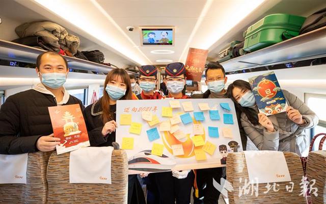 12月31日,在武汉开往深圳北的G77次列车上,乘务员在列车上与旅客互动,邀请旅客写下新年心愿,共同迎接2021年。