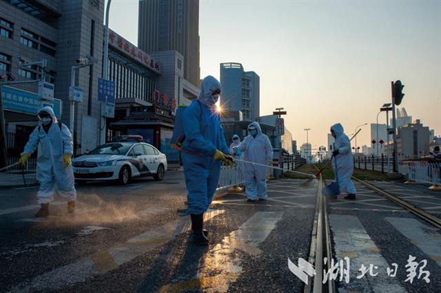 2020年2月4日,湖北省中医院门口,环卫工人正在进行消毒作业。为最大限度减少病毒滋生蔓延,武汉市城管、卫健、市场等多部门联合开展城市消毒工作,重点围绕医院、市场、社区、公共厕所、环卫设施等重点区域,持续开展消毒工作,严控疫情。