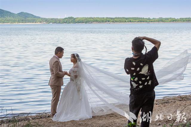 5月10日,武汉市东湖湖畔,一对新人拍摄婚纱照。随着婚姻登记机构恢复办理登记工作,解封后的武汉婚纱量订单大增,不少新人在武汉地标景点、街区拍摄婚纱照,婚庆市场呈现回暖趋势。