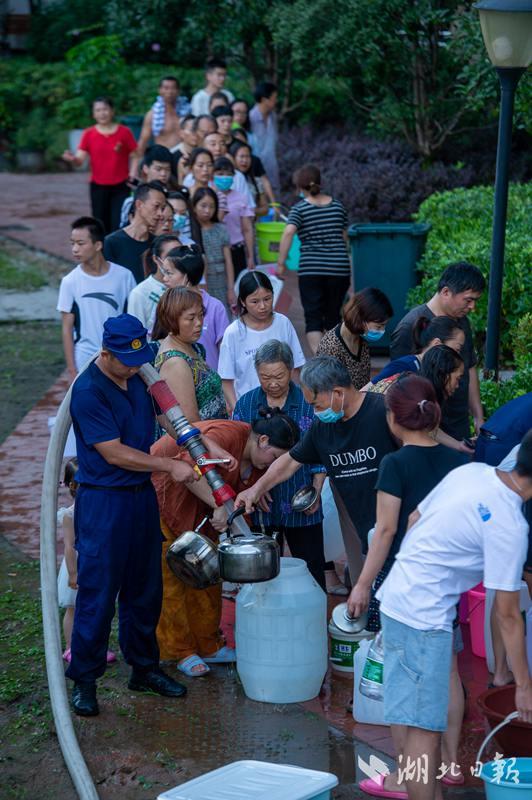 7月24日,恩施市中央华府小区,居民排队取水。受清江上游恩施市屯堡乡马者村地质灾害影响,恩施州城大部分居民区停水。连日来,恩施州消防救援部门先后调集特勤和恩施市、建始县、巴东县等县市的10个消防救援站,32名指战员,出动大功率水罐消防车12台,24小时轮流送水,缓解居民用水难题。