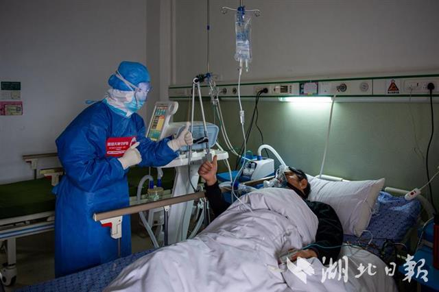 3月2日,武汉市第一医院感染科隔离病房,重庆医科大学附属第一医院精神科教授李静(左一)为患者进行心理疏导。