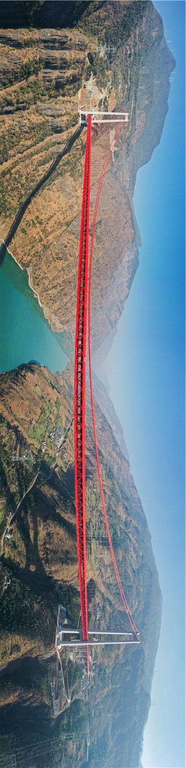 据悉,大桥创下多项纪录:世界最大跨径山区悬索桥;世界首座全桥采用U肋全熔透焊接工艺的桥梁;桥面宽27米,跨径1386米,宽度与跨径比达1/51,居世界第一;钢桁梁吊装系统跨径达1386米,为世界桥梁领域最大跨径缆索吊。