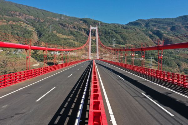 中交二航局参建的金安金沙江大桥是华丽高速公路项目重要控制性工程。大桥为主跨1386米的双塔双索面单跨简支板桁结合加劲梁悬索桥,是世界范围内在“三高地区”(高海拔、高差大、高地震烈度)建设的山区峡谷钢桁梁悬索桥。桥面与谷底江面垂直高差达335米。