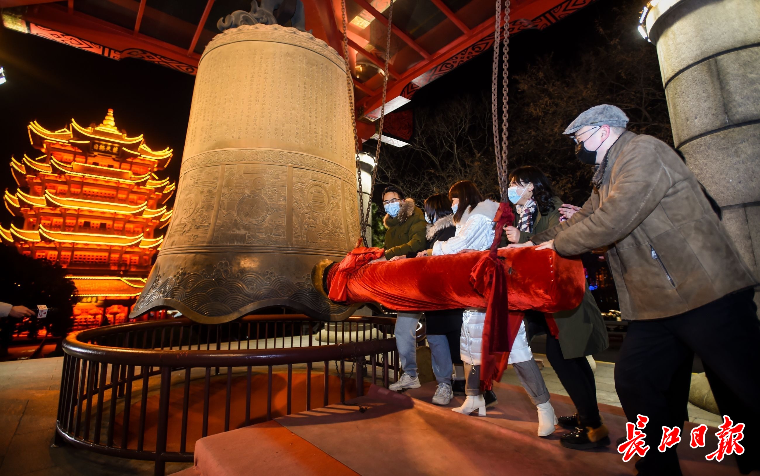 长江日报-长江网12月31日讯12月31日晚,《夜上黄鹤楼》演出在黄鹤楼公园上演。市民开心游园,逛年味集市,观看国潮舞狮。最后,市民代表敲响新年祈福千禧钟。(记者许魏巍 摄影报道)