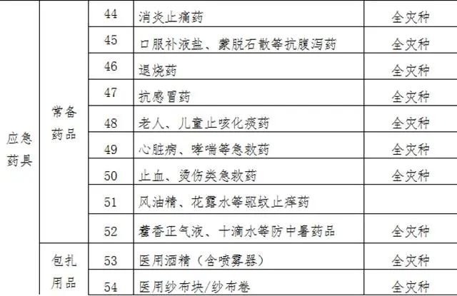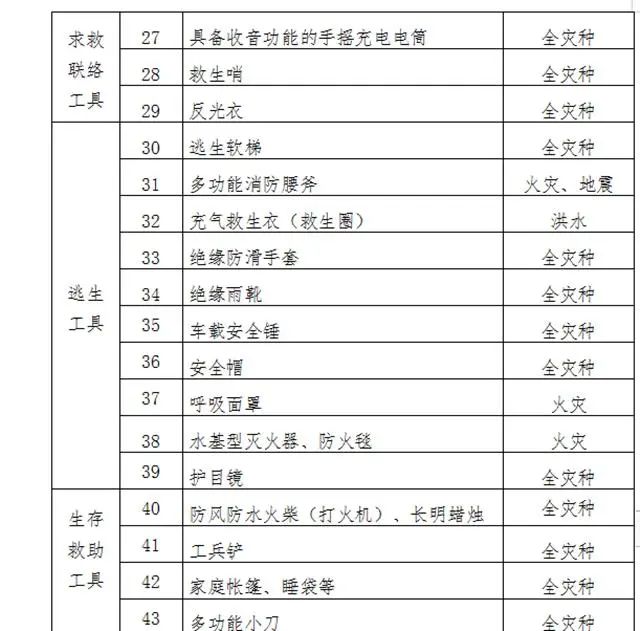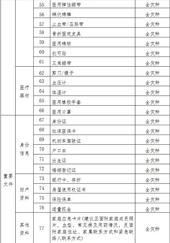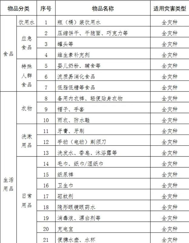基础版为常见灾害和适用全灾种所需物品,分基本生活物品、逃生自救物品、医疗应急物品3大类,包含了最基本的13项应急储备物资。扩充版以全灾种为考量,分食品、生活用品、应急物品、应急药具及重要文件等5大类、17小类,包含了77项备灾物资。