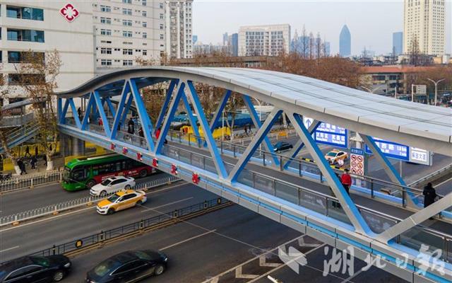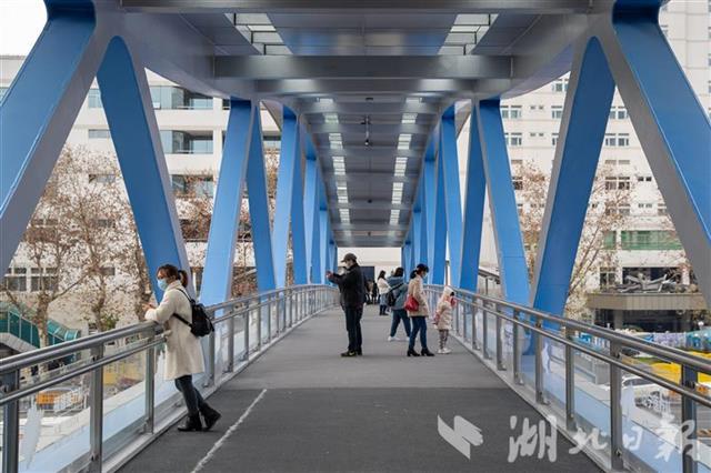近日,位于武汉市同济医院主院区门口的人行天桥建成开放。该桥命名为同济健康天桥,横跨交通繁忙的解放大道,连接同济医院门诊主楼和同济医院生殖中心,方便行人通行。