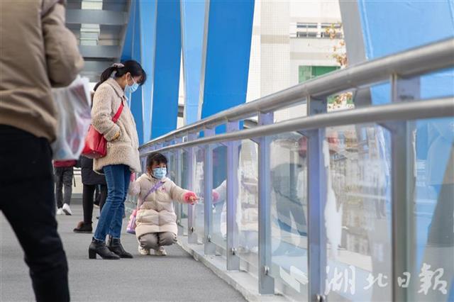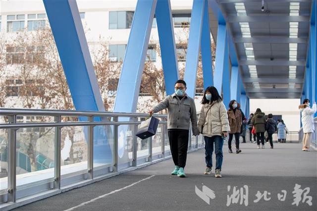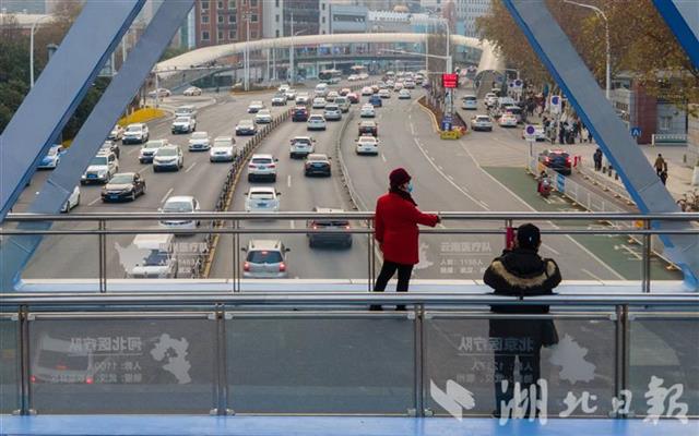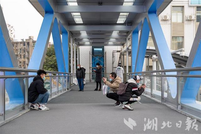 2021年1月3日,市民经过武汉同济健康天桥时拍照留念。