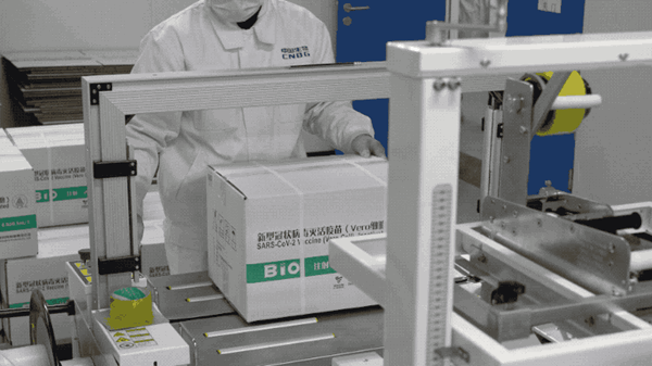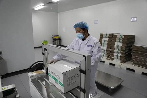 在分包装车间,S型的生产线正在有条不紊地运行。伴随着机器运转发出的“哒哒”声,一支支新冠疫苗依次经过灯检、贴标、装盒、贴条形码、装箱,最后打包入库。