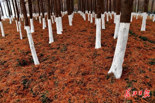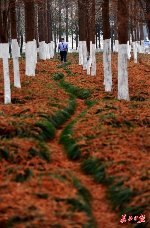 长江网1月5日讯 1月5日,沙湖公园大片池杉林下铺满了红褐色的落叶,将地面的草坪遮盖得严严实实。池杉细密的叶片蓬松有致,就像给大地盖上了一层绒毯。不时有游客从林间小道走过,犹如步入童话世界。(记者李永刚 摄影报道)