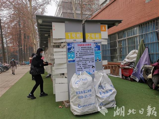 1月5日,武汉大学信息学部快递服务中心。湖北日报全媒记者看到一名学生取货后直接拆掉包装盒,并随手将包装盒放入中通快递绿色回收箱。