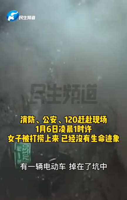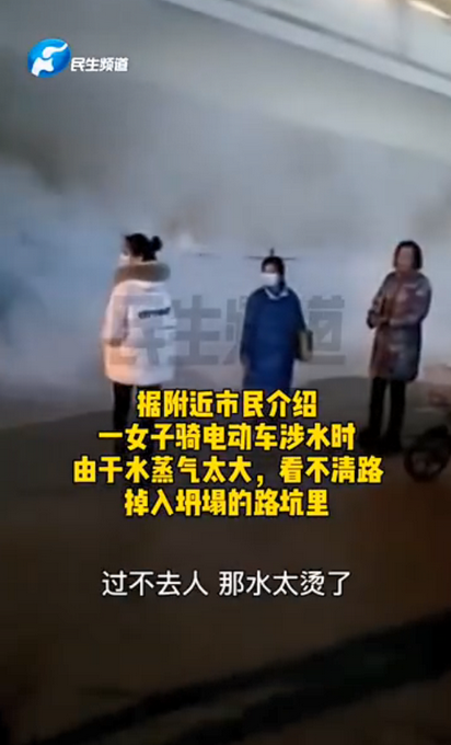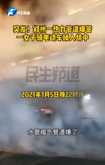 1月5日10点左右,郑州市建设路大学北路河医立交桥附近一处暖气管道爆裂,致使路面出现塌陷。一女子骑电动车涉水时,不幸掉入坍塌的坑中。据现场目击者称,截至凌晨1时左右,女子被打捞上来,当时已经没有生命体征。