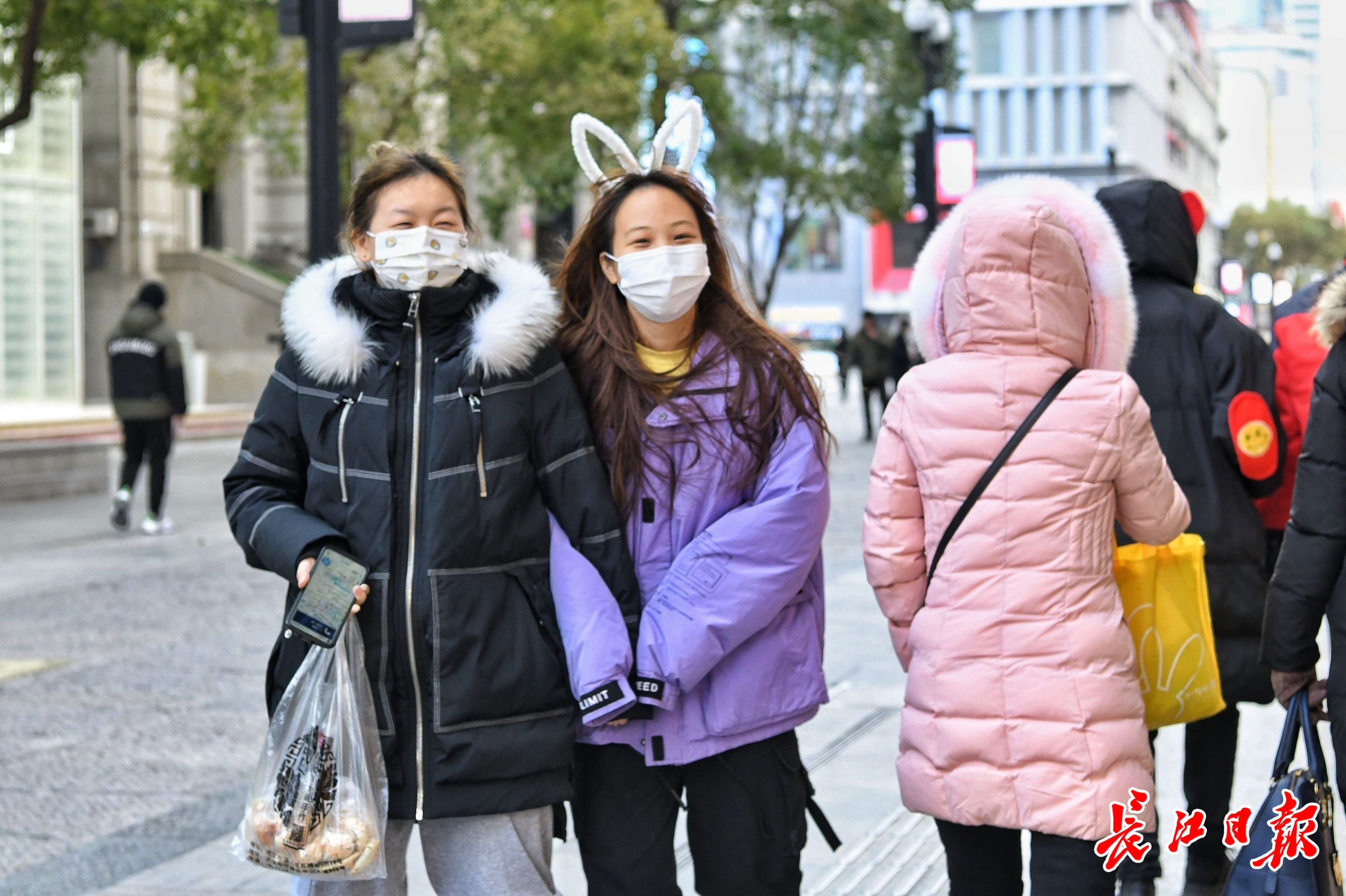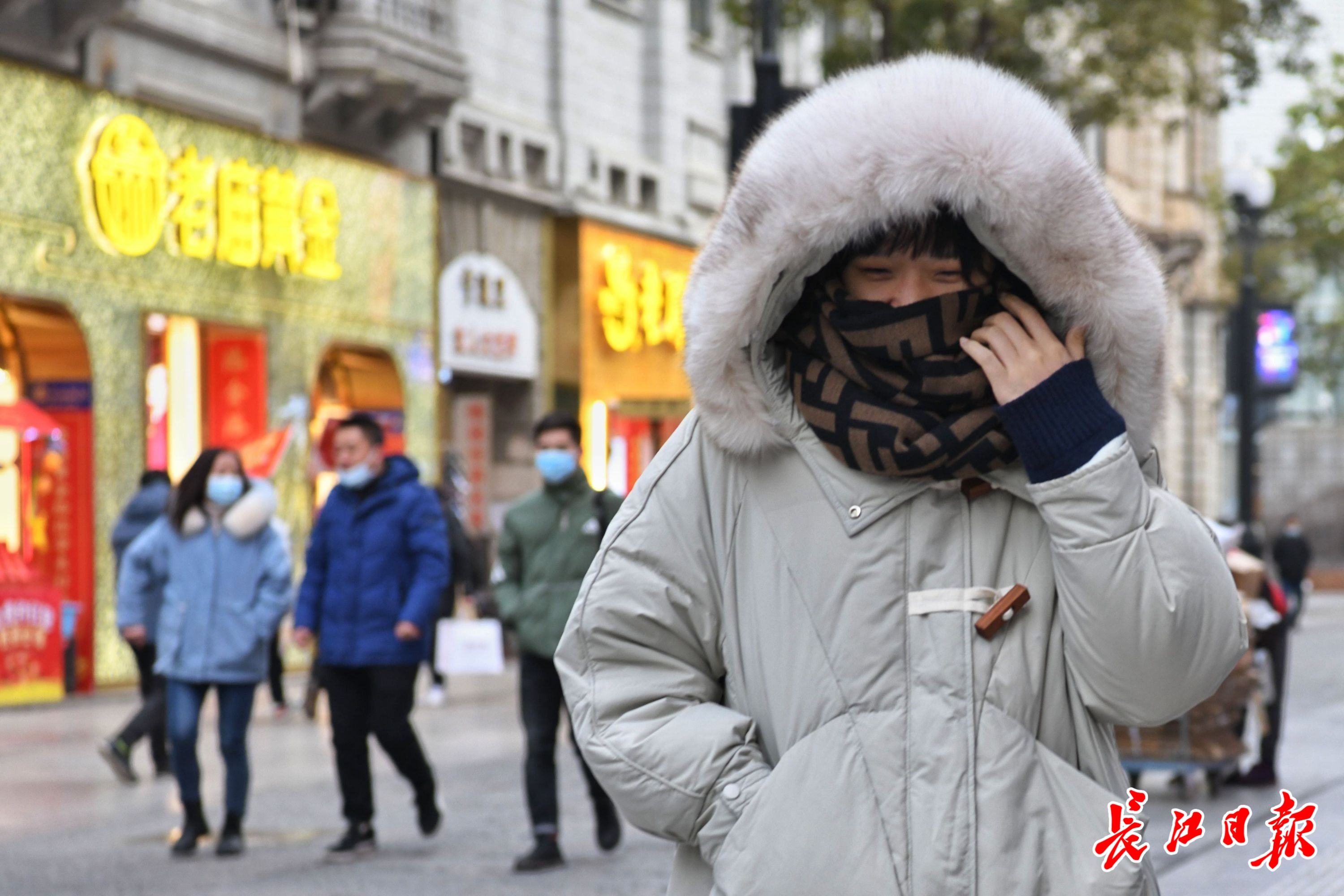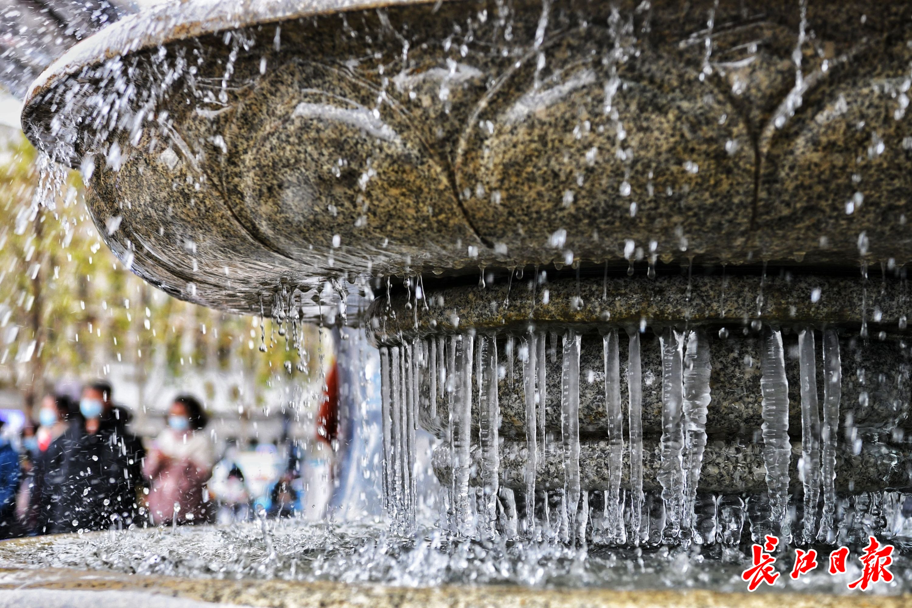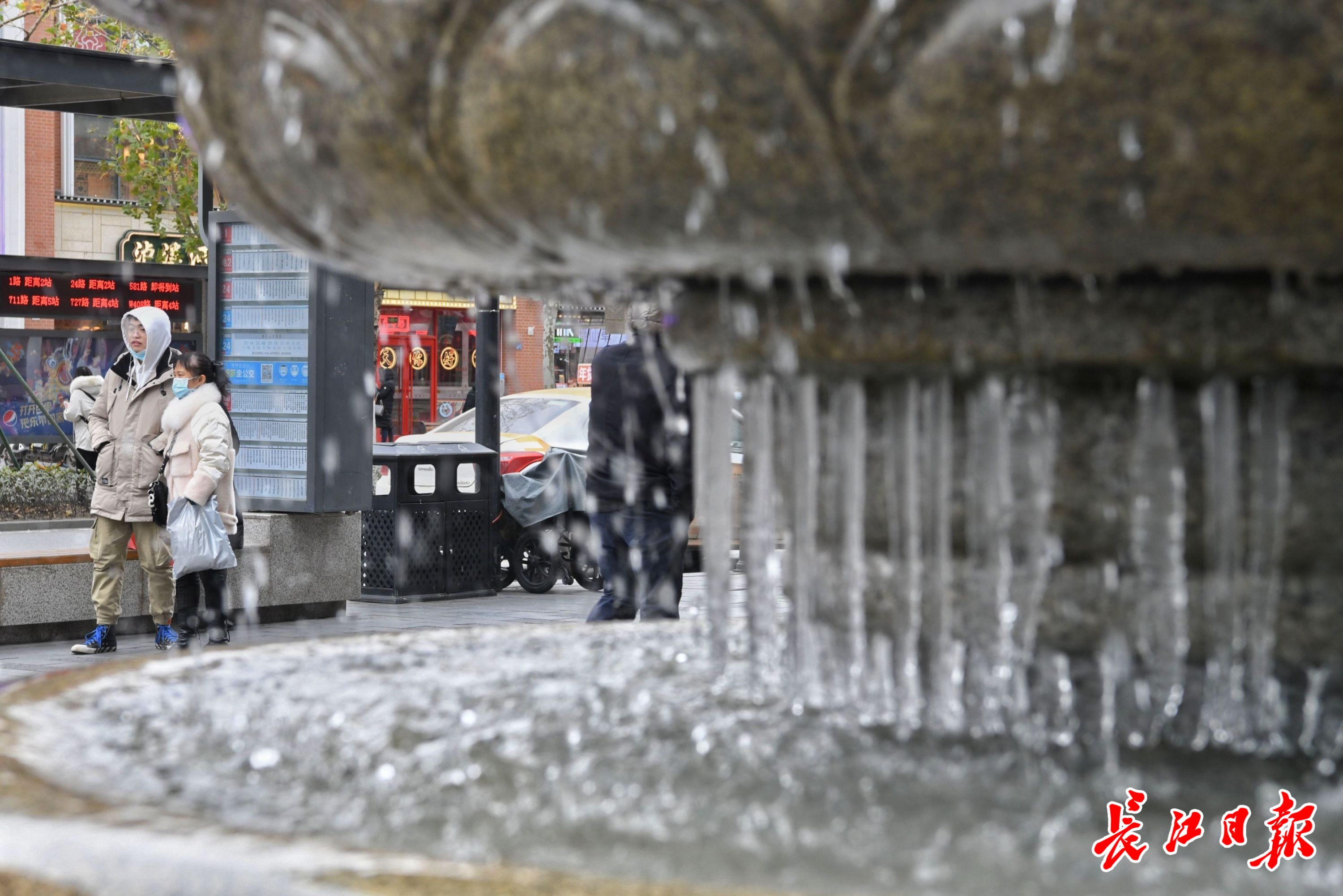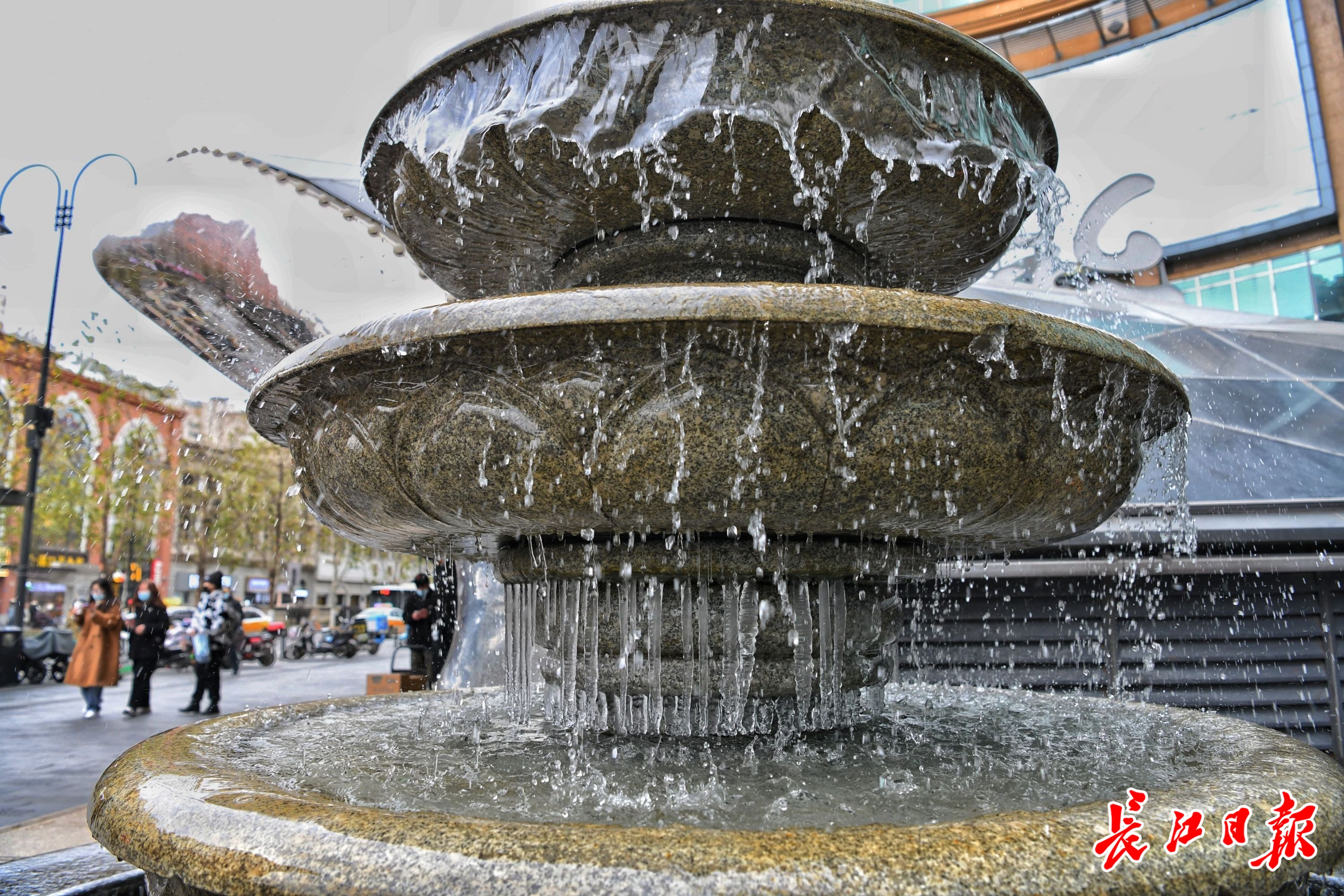 1月7日,江城最低气温仅-7℃,市民在凛冽的寒风中出行。汉口中山大道一商场旁,喷泉溅落的水花已凝结成冰挂,成为极寒冬日里的一道景观。(记者苗剑 摄影报道)