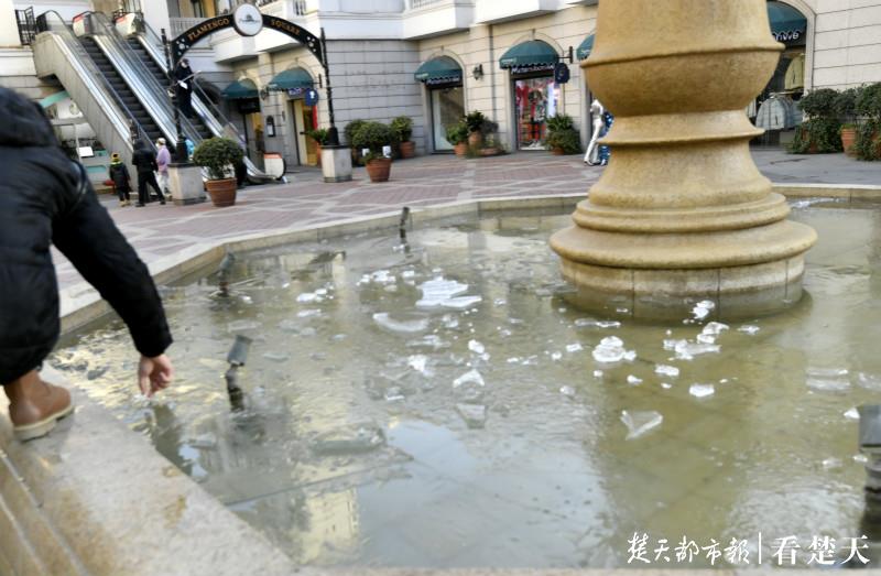 8日,光谷步行街意大利风情街街心喷泉池,结了厚厚的一层冰,年轻人好奇地撬冰玩