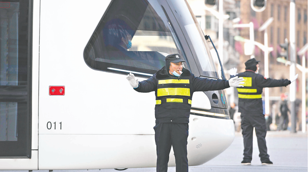 光谷街头有轨电车安全员顶着寒风在路口指挥。