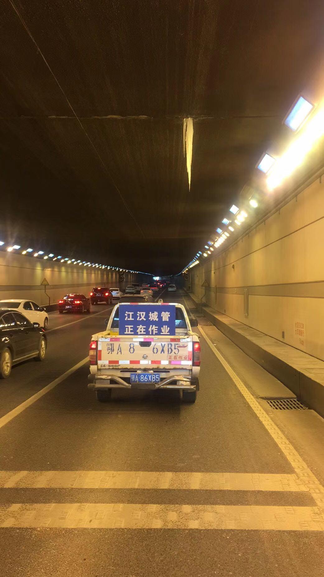 接到情况反映后,江汉区城管执法局立即安排巡查人员进行现场查看,发现通道内顶部确实有滴水结成了冰锥,最短的约1厘米,最长的有七八十厘米,大约覆盖通道内十余处地方。由于该地下通道只能机动车通行,而且顶部冰锥距离地面很高,他们便紧急调度环卫工人站在洒水车上对通道内沿途冰锥进行清除,同时安排皮卡车设置安全范围提醒周边车辆注意通行。经过一个多小时的清理,4名环卫工人将通道内13处结冰点全部清除。