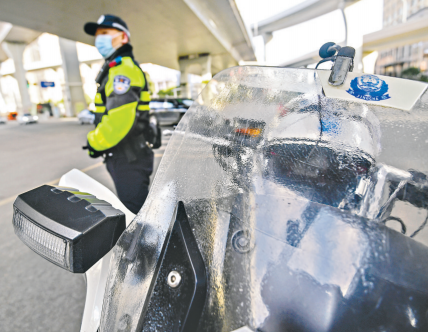 6时许,东湖高新汉警快骑队员王蒙穿好骑行服,去预热摩托车,摩托车的前护板结了一层厚冰,他用热毛巾捂了一会儿,冰裂开掉到地上。