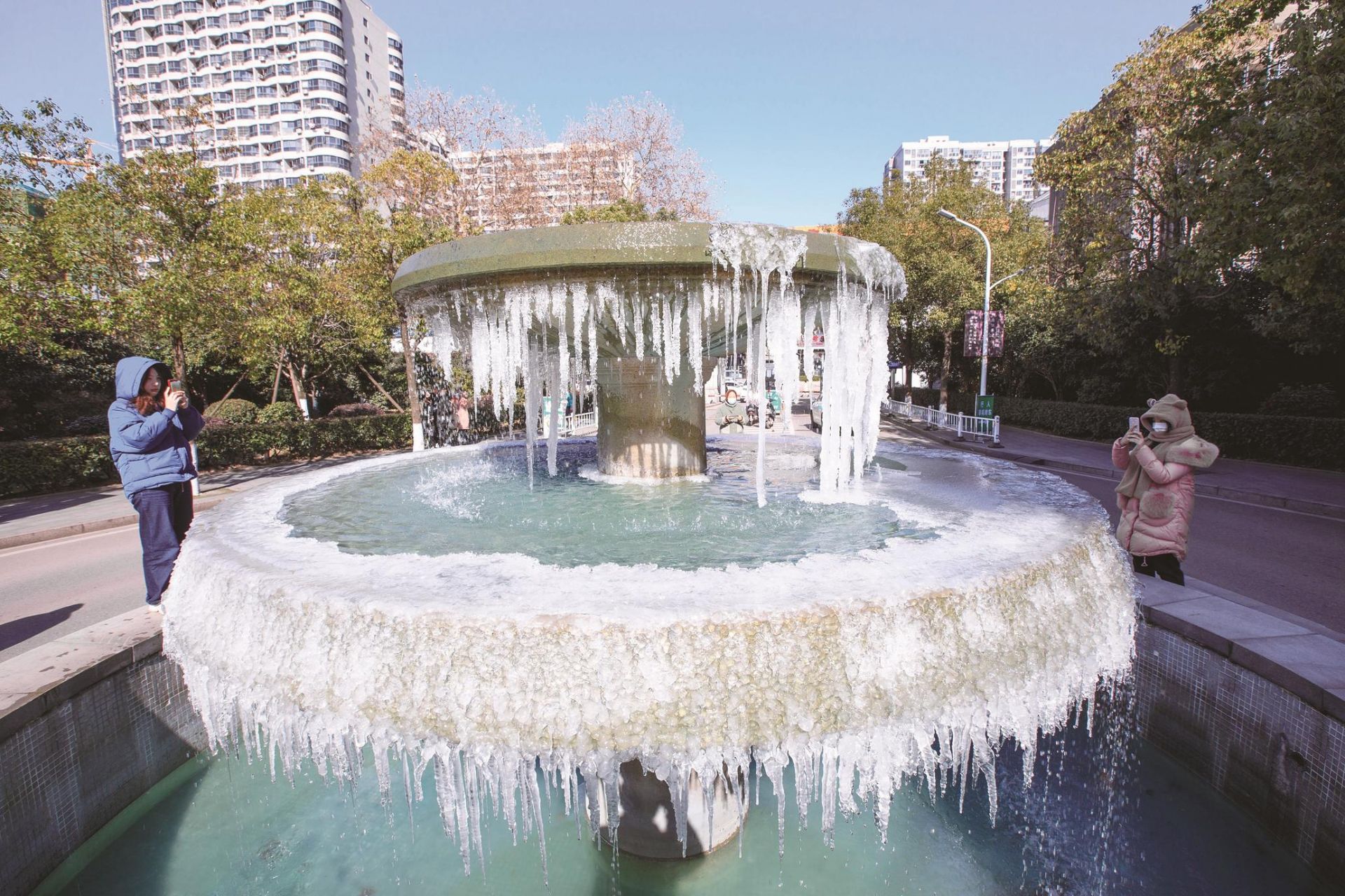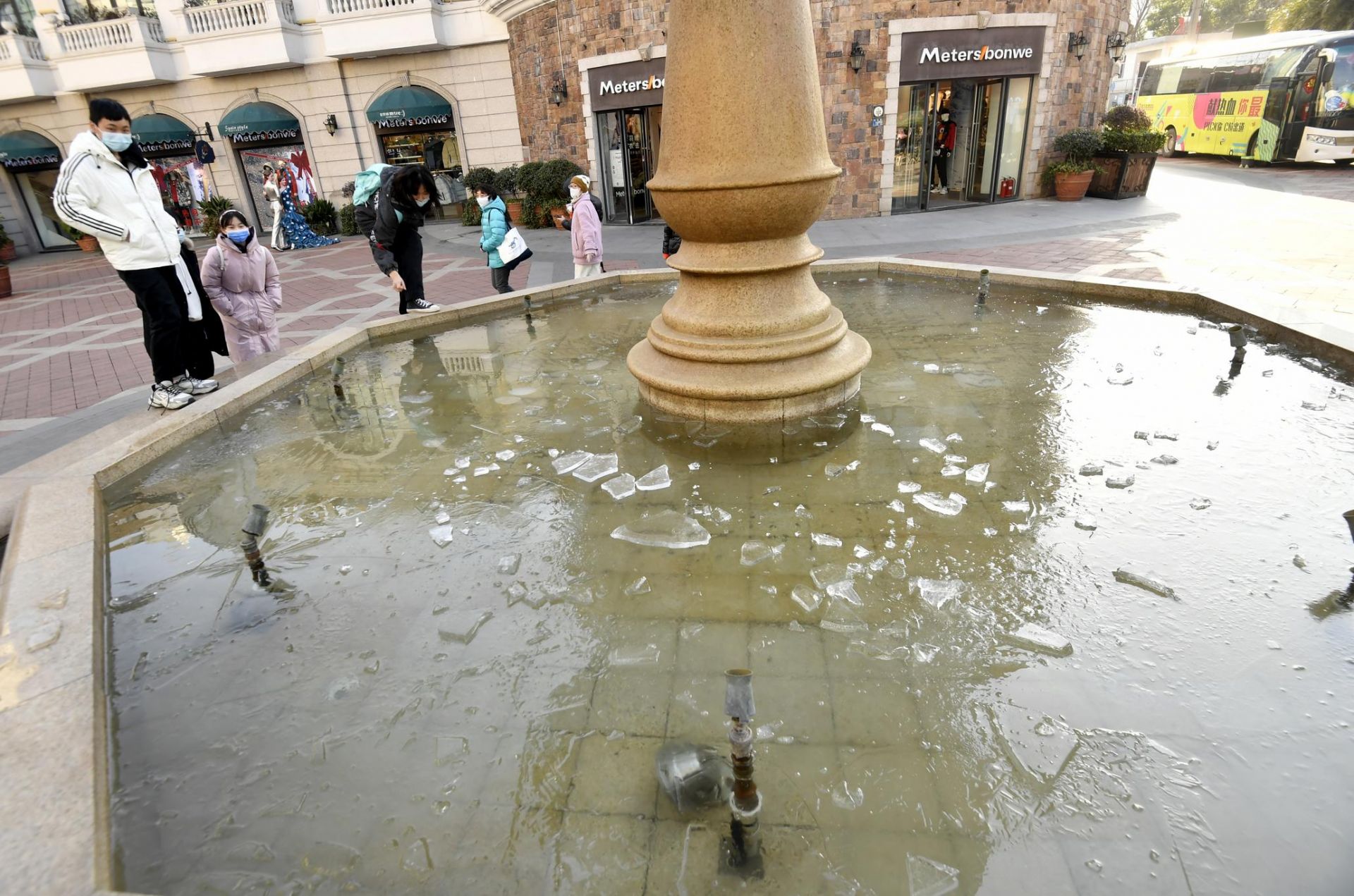 光谷步行街一处喷水池结了厚厚一层冰。(来源: 楚天都市报)