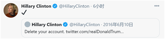 当地时间8日,希拉里转发自己2016年的一则推文,并配上了一个“√”的符号。2016年6月10日,希拉里曾发推称,“删除你的账号“。推文后附上了特朗普的推特账号链接。↓