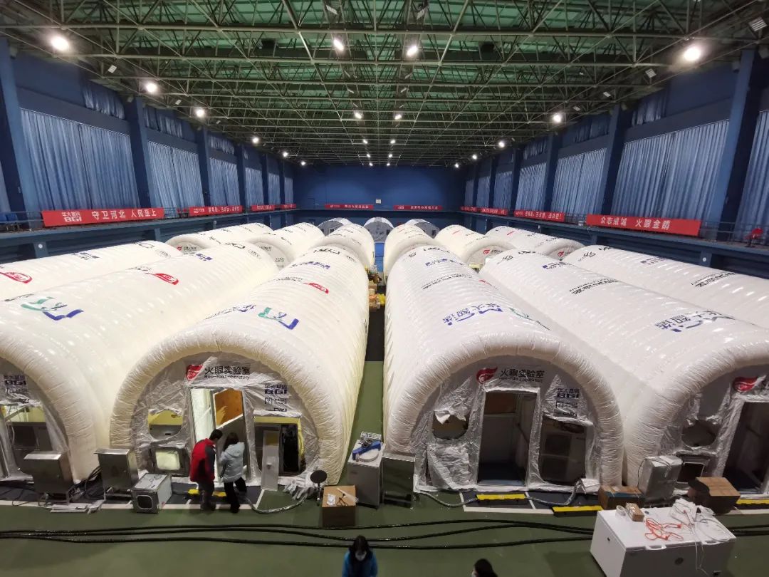 此次驰援河北的高通量气膜“火眼”实验室由12舱“火眼”实验室(气膜版)和3舱快装式负压硬气膜“火眼”组成。