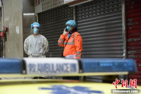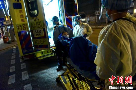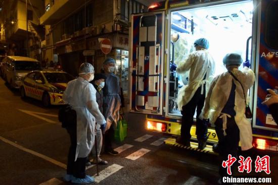1月10日,香港红磡颐和园护老中心有职员初步确诊,部分职员及院友须送检。傍晚时分,身穿防护衣物人员协助护老中心职员及院友送检。图为身穿防护衣物人员现场协助撤离。 中新社记者 李志华 摄
