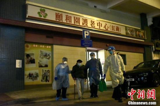 1月10日,香港红磡颐和园护老中心有职员初步确诊,部分职员及院友须送检。傍晚时分,身穿防护衣物人员协助护老中心职员及院友送检。图为身穿防护衣物人员协助院友送检。 中新社记者 李志华 摄