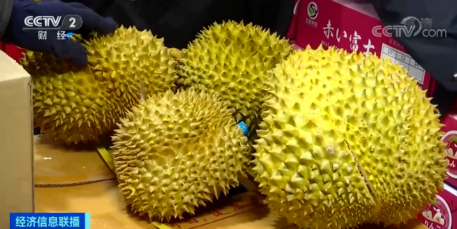 江苏凌家塘农副产品批发市场果品区商家 毕先生:今年榴莲是最贵的一年,一箱要贵两三百元的,相当于批发价一斤就要三十多元。