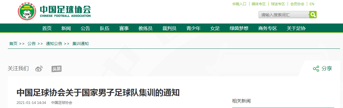 1月14日,中国足球协会官网发布《中国足球协会关于国家男子足球队集训的通知》,宣布最新一期国家队集训大名单,武汉卓尔两名队员明天、董春雨入选。