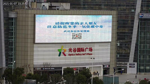 武汉市光谷国际广场户外显示大屏正在播放防一氧化碳中毒安全宣传视频。 通讯员何博 供图
