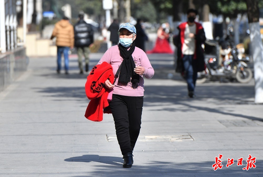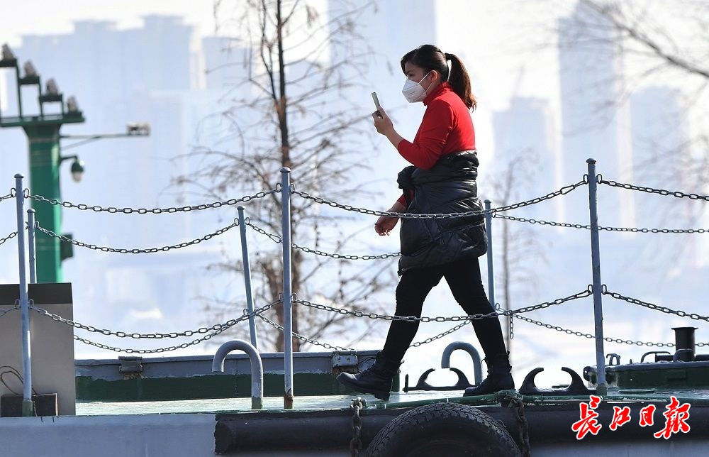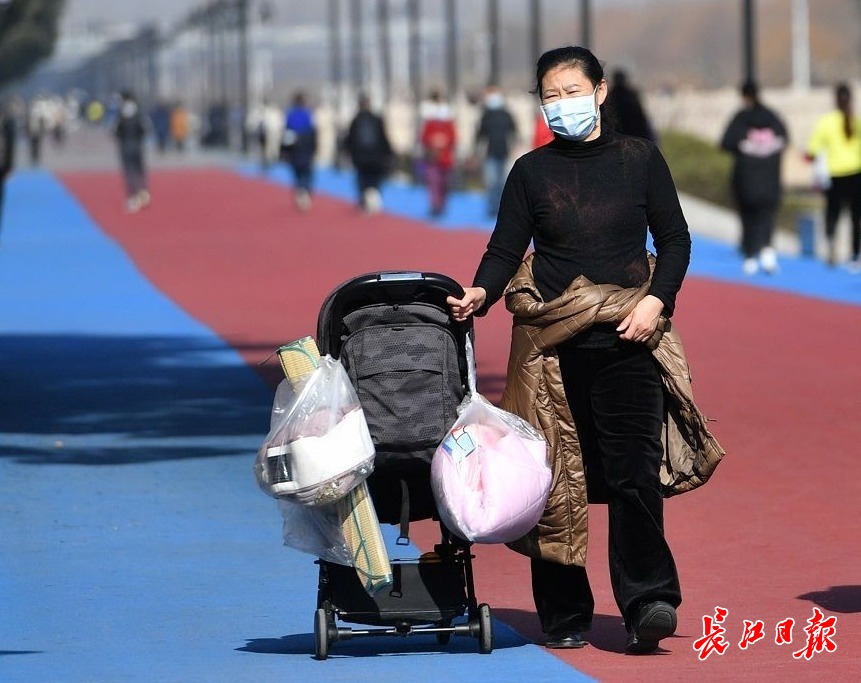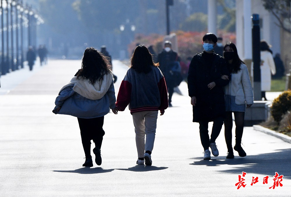 1月14日中午,在沿江大道和汉口江滩,不少行人脱下了厚厚的棉袄。午时的气温接近18摄氏度,让人觉得春天仿佛来了。不过据气象台消息,大幅降温天气已在来的路上。(记者喻志勇 摄影报道)