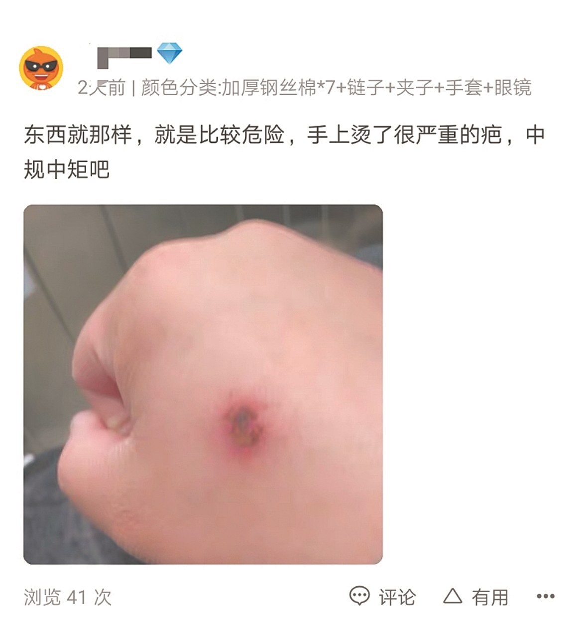 记者在看买家评价时发现,一位买家表示“东西比较危险,手上烫了个很严重的疤”,并上传了一张手部被烫伤的照片。